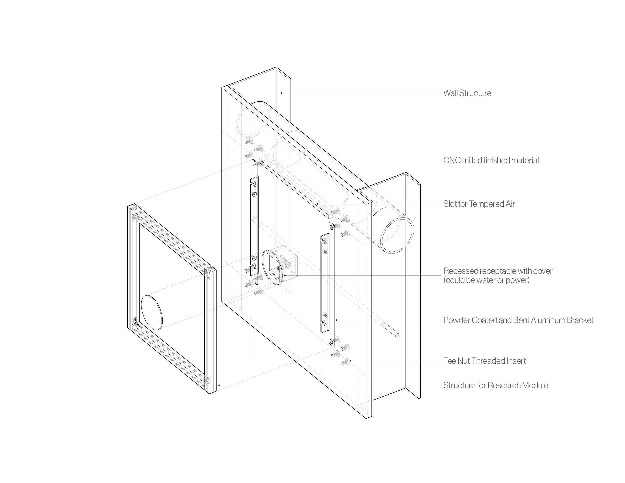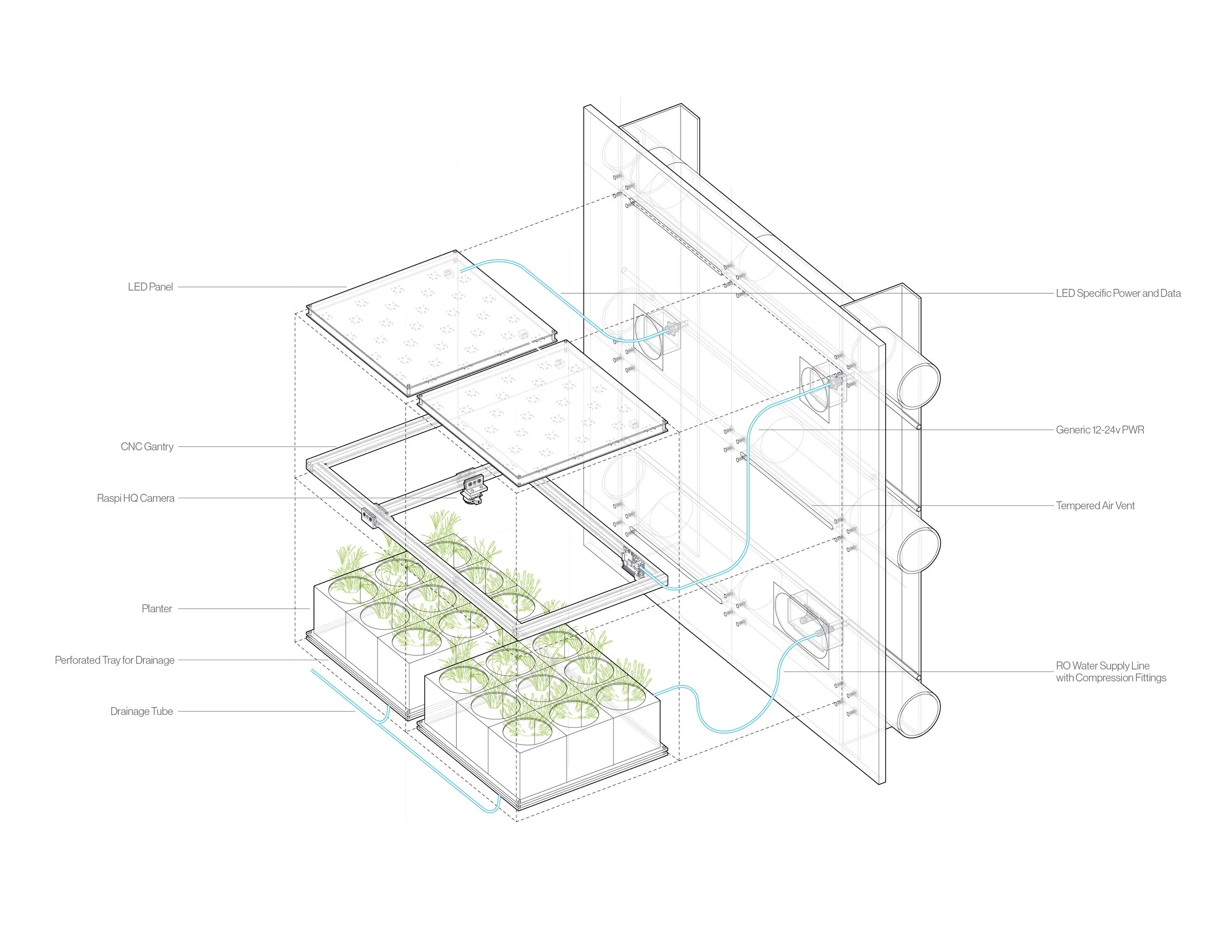 Capsules are controlled environments at the architectural scale, enabling growth, evaluation, and mediation of entire ecosystems. Simulated growth conditions may be programmed based on ecosystems spanning vastly different spatial scales, time zones, and climates. This project scope was multi-year and included initial architectural detailing of the room as well as creation of elements for the room.
