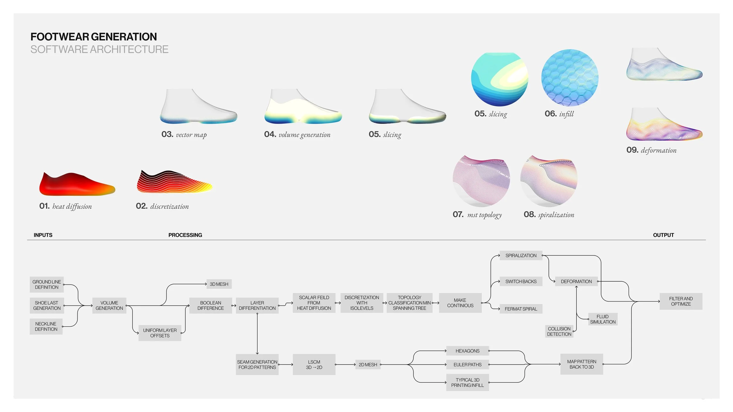 The process itself required a re imagining of how footwear should be made from ground up. I developed a processes for working polymers as well as custom shoe generation software.