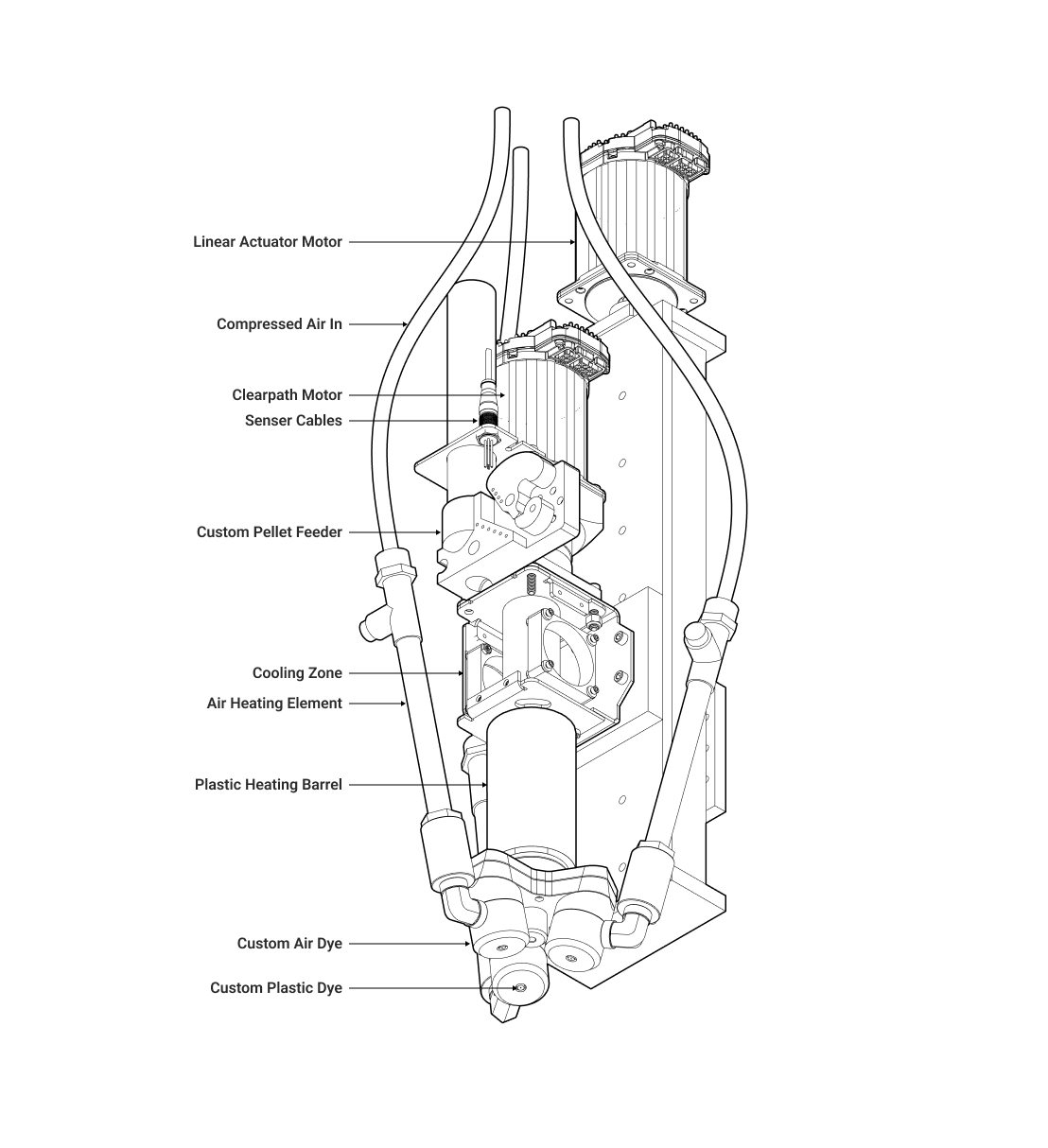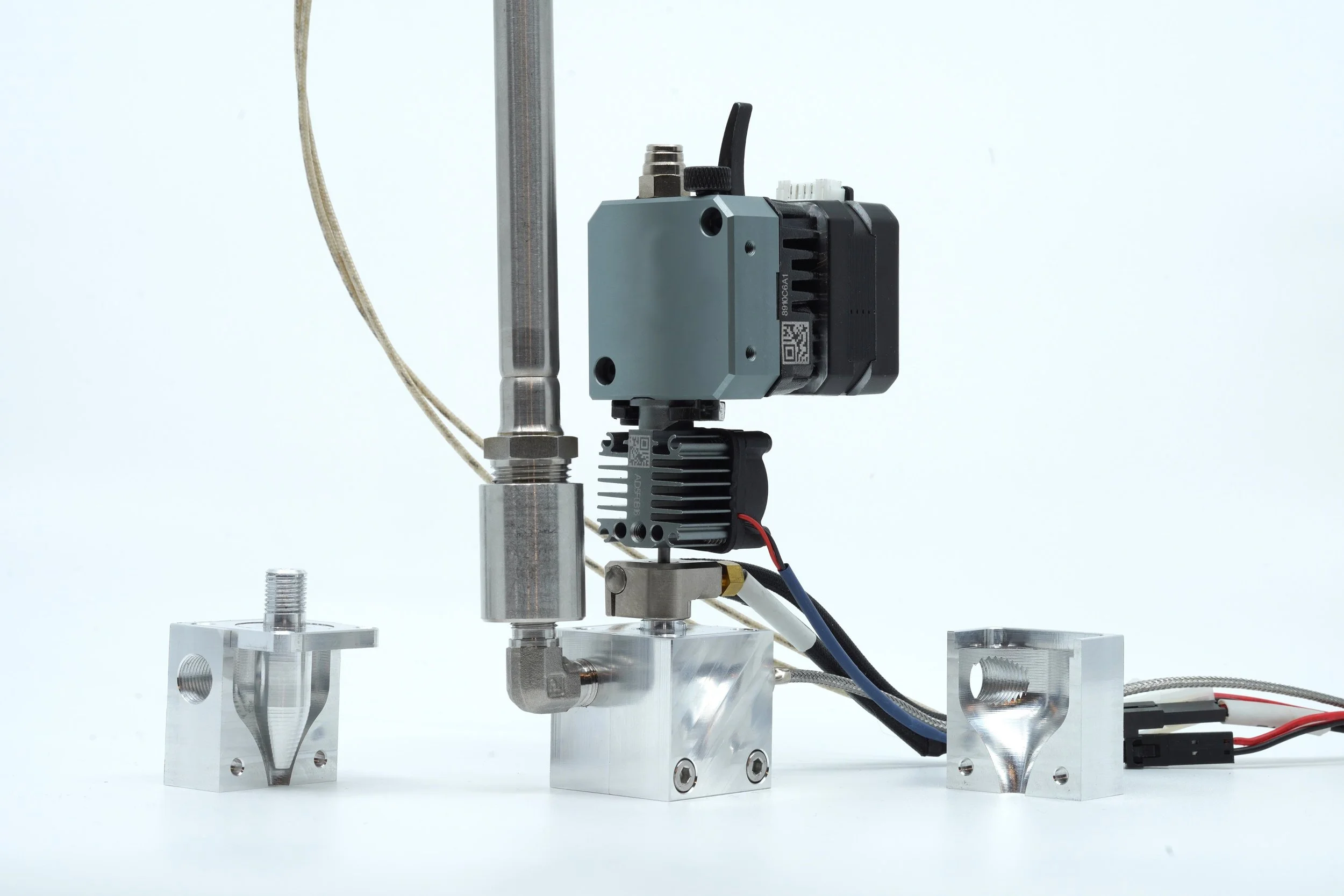 A key part of the Ozero platform was building process-specific extrusion hardware that could be paired with multi-axis motion. Each head required different thermal architecture, pressure generation, sensing, and control logic, but all were designed to integrate cleanly with the robotic cell and the slicing pipeline so process parameters could be scheduled along the toolpath.
