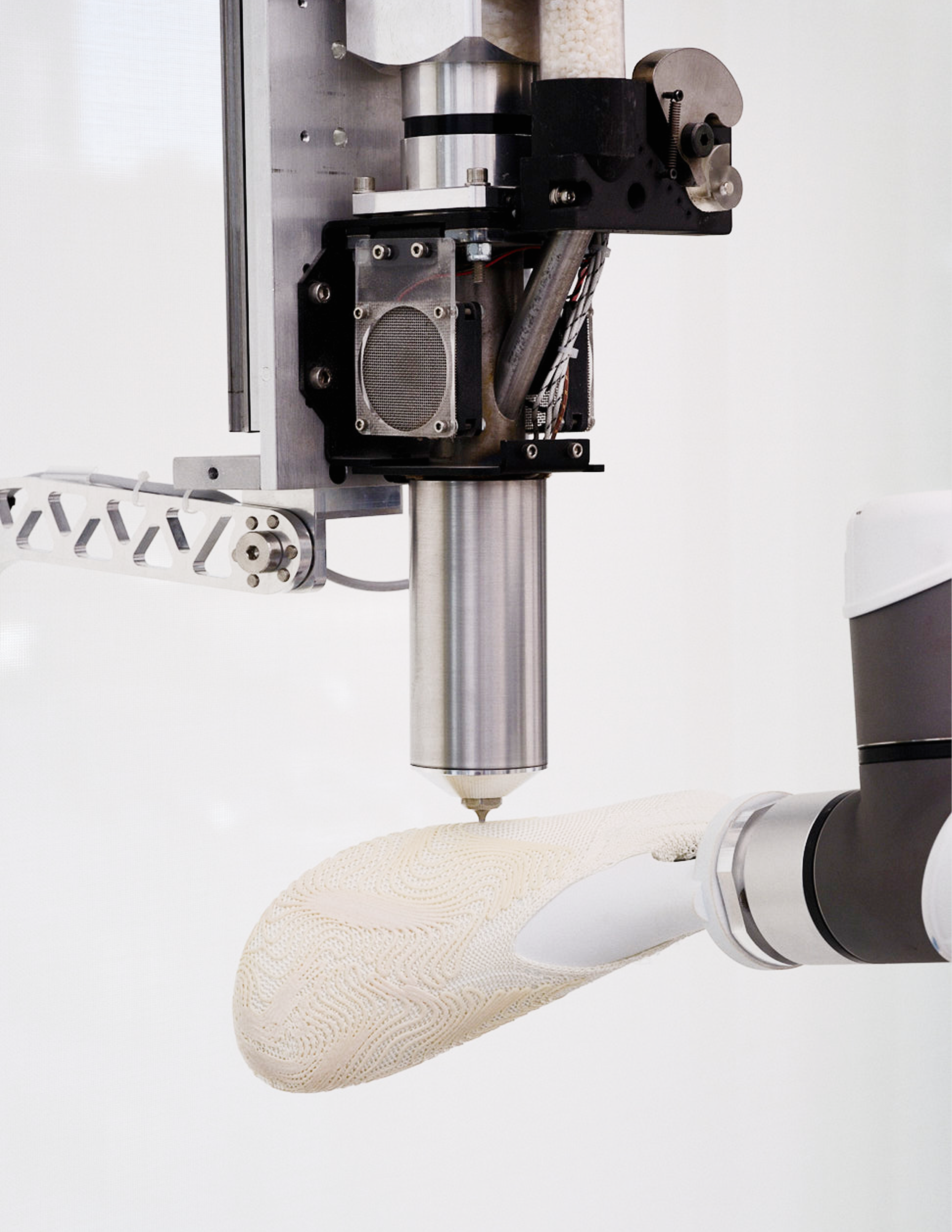 The project started with the invention of non planar 3d printing to create a footwear project. I worked on the original setup using collaborative robots, a custom printing setup, and custom code.