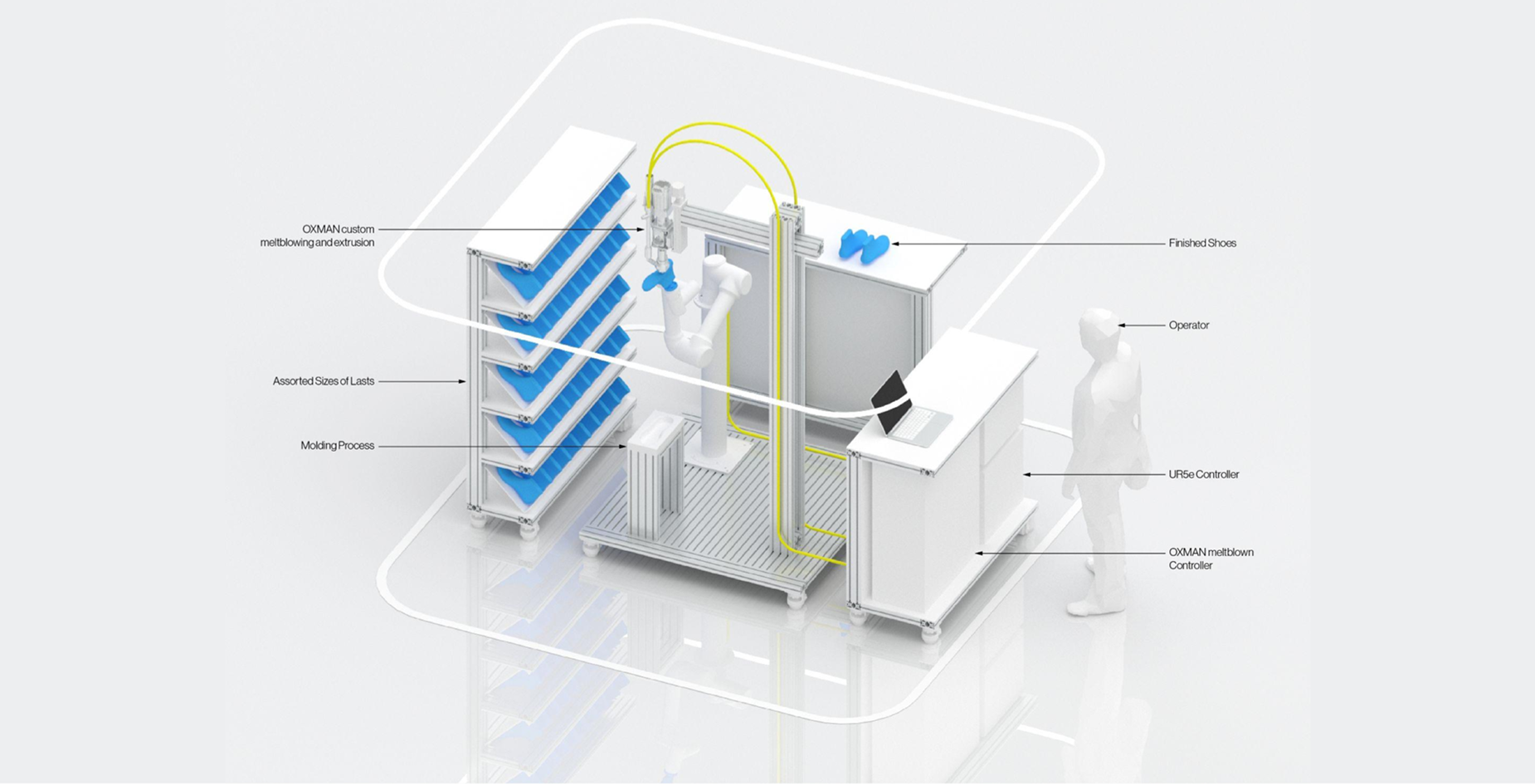 The Oᵒ platform is a vertically integrated footwear platform that couples biomaterial-based parts with robotic manufacturing and computational design. The work is presented as a prototype manufacturing environment that makes the pipeline legible from material production through finished product.